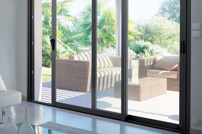 - La baie coulissante ALUMINIUM, robuste et résistante qui autorise les plus belles compositions, les styles loft ou atelier et les formats XXL pour profiter d’un maximum de lumière naturelle ou d’une plus grande vue sur le jardin.
